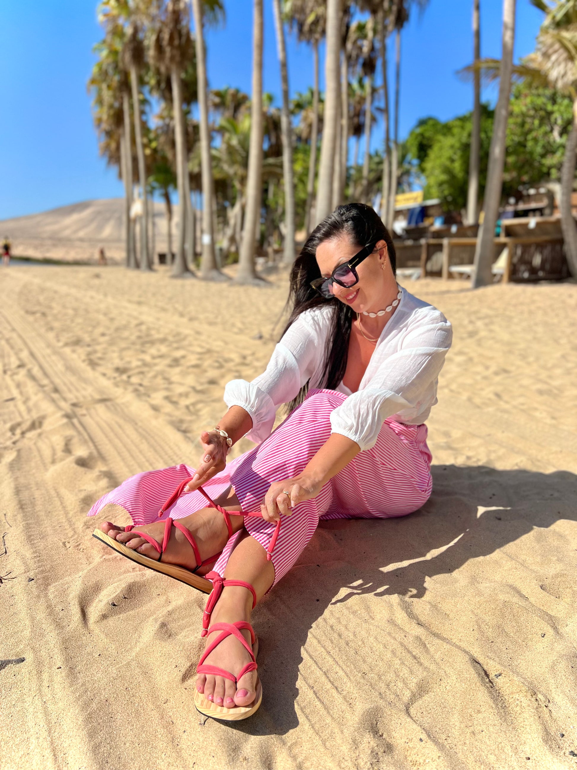 Each material is carefully selected one by one, and hand-cut by us! The total length of the fabric is 76 cm/30 inches long! The lace-up design allows for a customizable fit, ensuring comfort and stability, while the interchangeable laces let you easily switch up the look, offering multiple style options to match your outfit or mood. Whether you prefer a classic, bold, or playful vibe, you can quickly change the laces for a fresh look. The sandal’s breathable material keeps your feet cool, while the durable construction ensures long-lasting wear. Perfect for casual outings, travel, or everyday use, this sandal blends practicality with stylish customization.